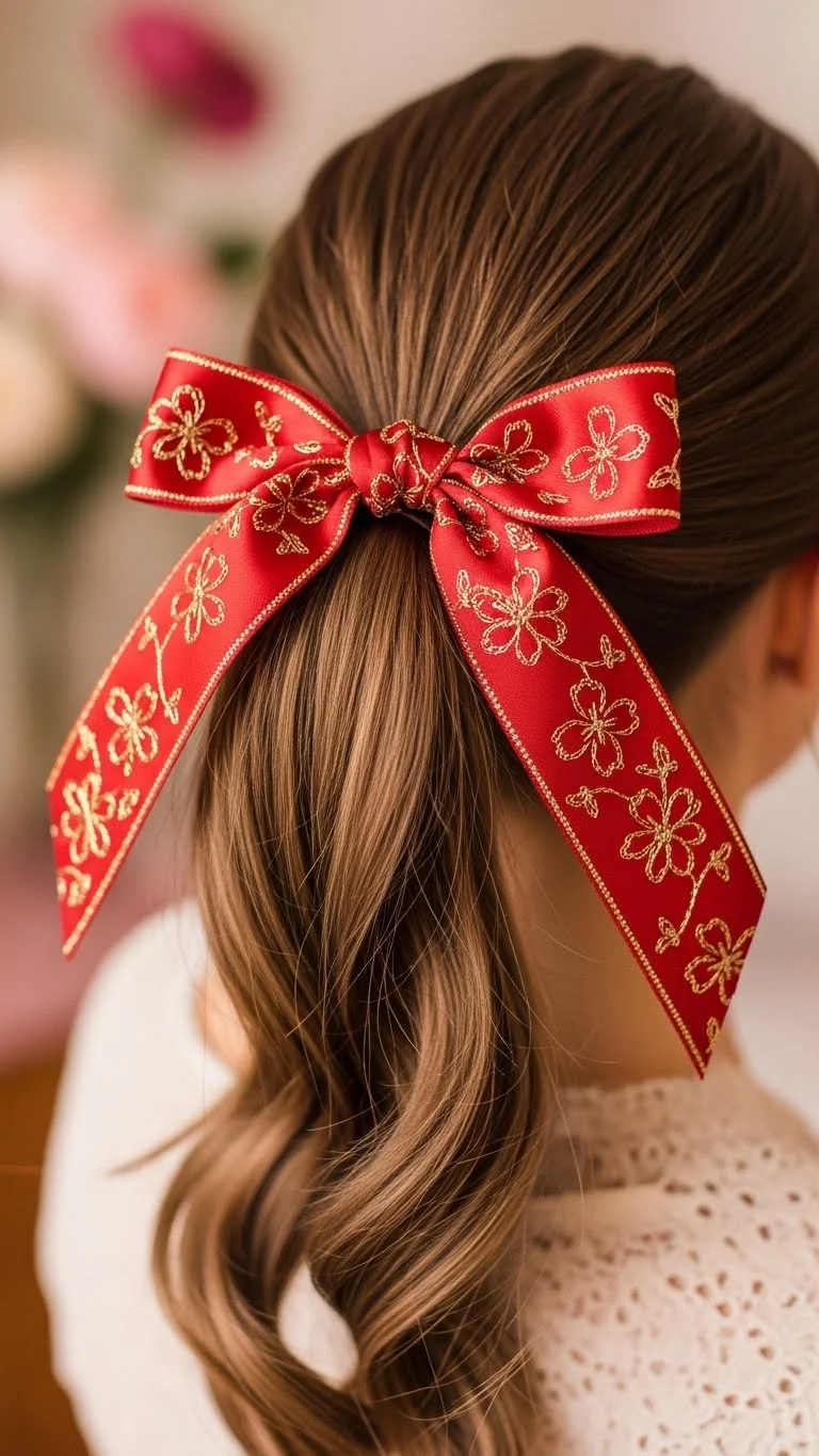 A simple ponytail can become a romantic statement with the addition of a pretty ribbon. This is an incredibly easy and affordable way to add a festive touch. Gather your hair into a ponytail at any height you prefer. Secure it with a regular hair tie. Then, take a beautiful ribbon – red, pink, or a pattern – and tie it around the base of your ponytail in a bow. You can let the ends of the ribbon hang down or trim them. This small detail instantly elevates your ponytail from casual to charming, making it perfect for Valentine’s Day.
